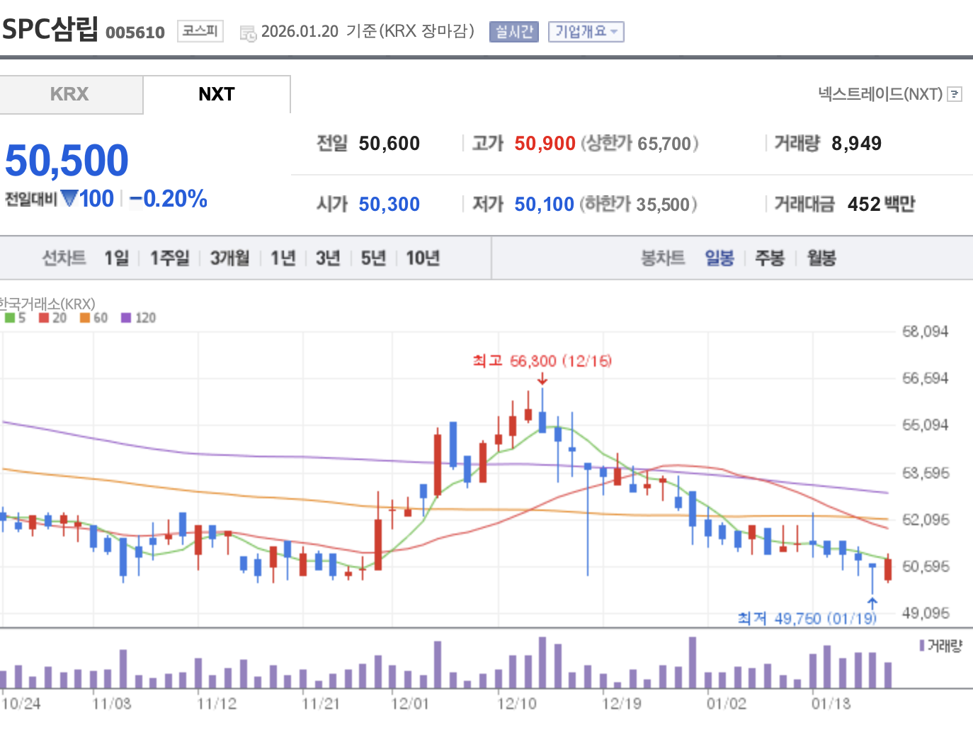최근 음식료주 전반이 강세를 보이는 가운데, SPC삼립(005610) 은 상대적으로 조용한 흐름을 이어가고 있습니다. 주가는 5만 원 초반에서 횡보 중이지만, 지주사 체제 전환(상미당홀딩스 출범) 이슈와 함께 중장기 재평가 가능성을 두고 시장의 시선이 엇갈리는 상황입니다.