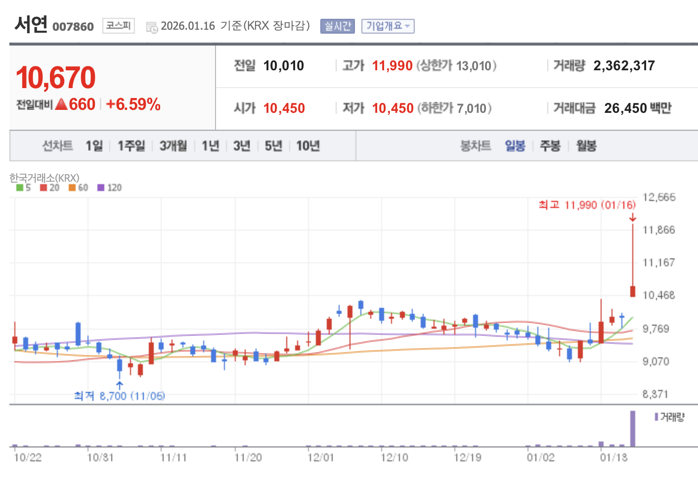 서연은 거래량 236만 주, 주가 +6.59% 급등이라는